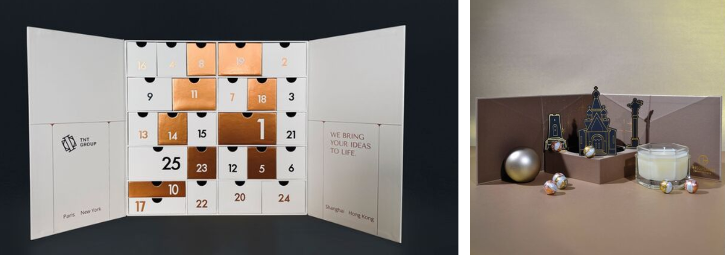 TNT Group propose notamment un calendrier de l’Avent et un coffret découverte réalisés en carton et papier certifiés FSC. Le calendrier se distingue par une structure composée de 24 tiroirs découpés, offrant une présentation à la fois organisée et personnalisable. Le coffret découverte, de forme octogonale, est destiné à accueillir des miniatures de parfum et peut être adapté selon le nombre de compartiments, les volumes, les matériaux et les finitions.